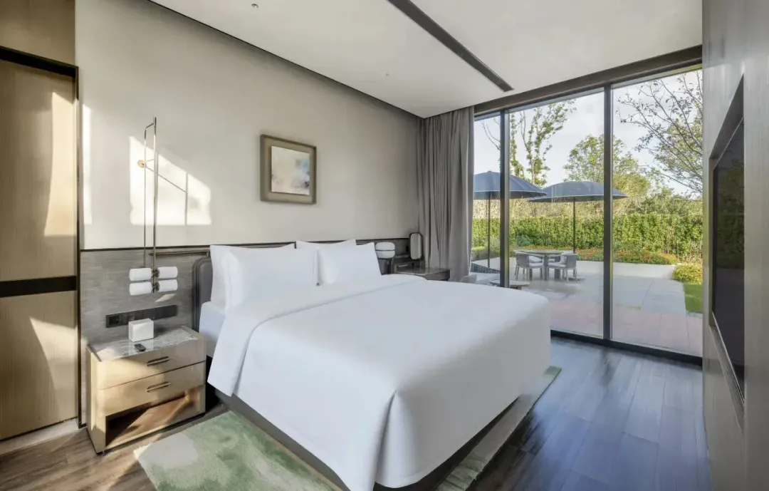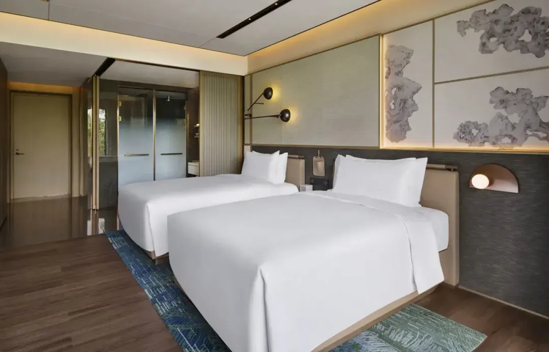 - Camas e Cabeceiras : Camas macias e sob medida com cabeceiras que combinam madeira clara e tecidos texturizados — como um abraço de um cobertor de luxo. A arte atrás da cama? Uma referência sutil às famosas paisagens de pedras de Suzhou.